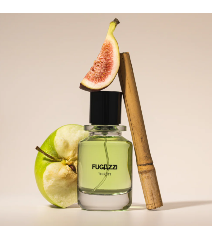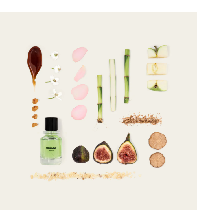 Thirsty combine des senteurs fraîches et sucrées de pomme, de figue, de bambou et de campanule, avec des notes florales de rose et de jasmin, entrelacées avec une base de cèdre, d'ambre et de musc pour imiter la sensation d'une journée d'été sans fin.